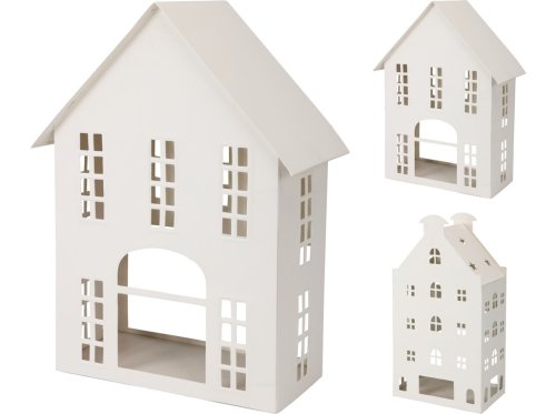 Plechový svietnik v tvare domčeka s rozmerom 200×110×320 mm, určený pre čajovú sviečku. Biele prevedenie je dodávané v mixe, jednotlivé kusy sa môžu líšiť tvarom okien alebo drobnými detailmi.