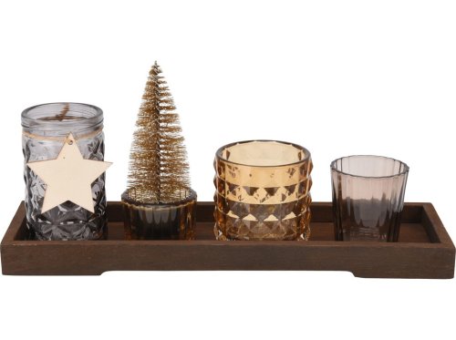 Sada šiestich sklenených svietnikov rôznych rozmerov je umiestnená na drevenej tácke a ponúka farebný mix pre dekoratívny efekt. Sklenené svietniky vytvárajú jemné a hrejivé svetlo, zatiaľ čo drevený podstavec dodáva interiéru prírodný vzhľad. Ideálne pre stolný aranžmán, parapet alebo slávnostnú výzdobu.