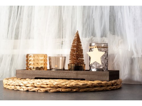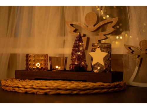 Svietnik sklo 6ks set 55x38/57x60/57x97/70x67mm na drev.tácku, farebná