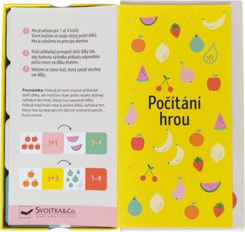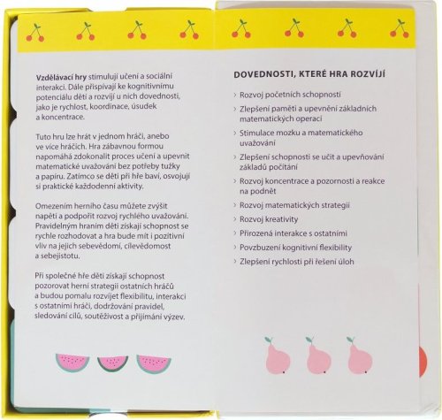 Deti postupne prikladajú dieliky so správnymi výpočtami k dielikom so zodpovedajúcim počtom kusov ovocia. Táto vzdelávacia hra stimuluje a rozvíja u detí zručnosti, ako je rýchlosť, koordinácia, úsudok a koncentrácia. Hru je možné hrať samostatne, ale aj s viacerými hráčmi a nemusíte mať po ruke ceruzku ani papier! Hra prispieva k upevňovaniu matematického uvažovania a zlepšuje rýchlosť pri riešení úloh aj reakcií na podnety.
