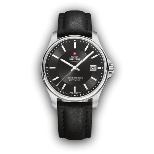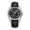 Pánske náramkové hodinky Napájanie z batérie Priemer puzdra 39,0 mm Puzdro v tvare kruhu Oceľové puzdro Strieborná farba puzdra Kožený ťah ČIERNE farba ťahu Ručičkový ciferník Čierna farba ciferníka Ciferník s dvanástimi indexmi Materiál skla - zafírové sklo Odol