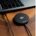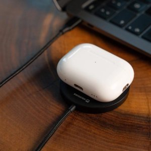 Kompaktná konštrukcia z hliníka a silikónovej gumy s priemerom 59 mm a hrúbkou len 7 mm zaisťuje výborný odvod tepla, vysokú odolnosť a príjemný dotyk. Opletený USB-C kábel dĺžky 1,5 m poskytuje dostatočnú slobodu pri používaní. Nabíjačka umožňuje bezdrôtovo nabíjať aj slúchadlá AirPods vrátane Pro 1. a 2. generácie výkonom až 5 W.