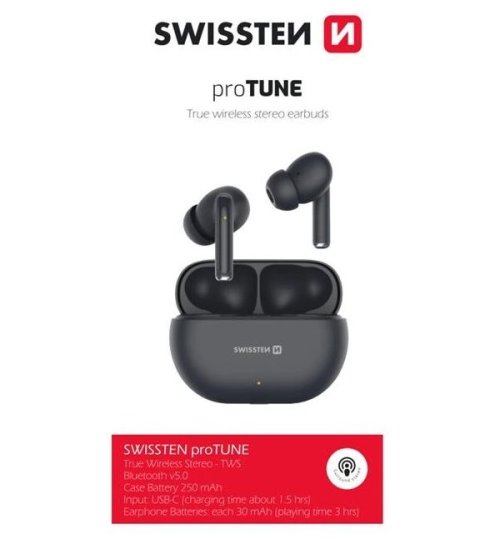 Bezdrôtové slúchadlá SWISSTEN proTUNE v ľahkom dizajne, ktoré sú určené pre komfortné počúvanie na cestách. Ich váha dosahuje iba 2× 3,2 g a vďaka malým rozmerom sa pohodlne nosí v ušiach po dlhú dobu. Slúchadlá SWISSTEN proTUNE podporujú taktiež jednoduché ovládanie hudby a umožnia vám pozastavenie prehrávania alebo zmenu skladby. Bezdrôtové pripojenie zaisťuje technológia Bluetooth 5.0 , vďaka čomu je spárovanie so smartphonom, tabletom alebo notebookom rýchle a stabilné. Súčasťou slúchadiel je aj integrovaný mikrofón , ktorý vám umožní jednoduché a efektívne vybavovanie mobilných hovorov. Nechýba ani praktické puzdro , ktoré okrem nabíjania plné aj ochrannú funkciu pri prenášaní vo vrecku. Headset do uší SWISSTEN proTUNE zvládne až 3 hodiny kontinuálneho počúvania hudby, podcastov, audio kníh, rozhlasového vysielania a ďalšieho audio obsahu.