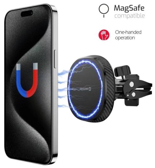 Magnetický držiak do ventilačnej mriežky auta s podporou prichytenia MagSafe zaistí pevné a bezpečné uchytenie iPhonu. Veľmi silné čeľuste do ventilácie sa uťahujú zo zadnej strany, teda tu nehrozí, že by držiak vypadol. Zároveň vďaka kĺbu, ktorý drží magnet, si pohodlne nastavíte a zafixujete uhol telefónu.