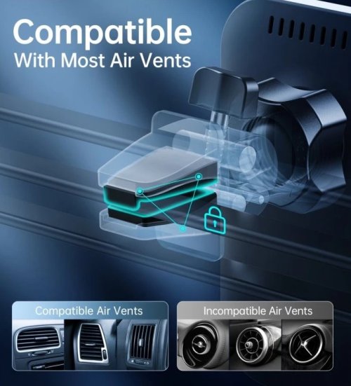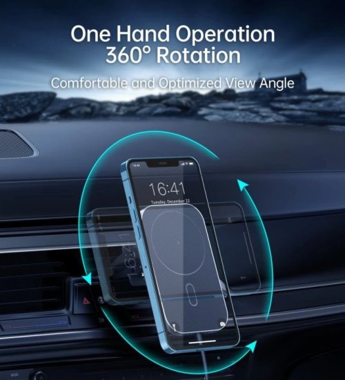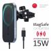 Magnetický držiak a bezdrôtová nabíjačka v jednom s uchytením do ventilácie auta . Čeľuste držiaka sú opatrené gumou, vďaka ktorej nedôjde k poškodeniu mriežky ventilátora. Umožňuje bezdrôtové MagSafe nabíjanie , to je určené pre majiteľov iPhone 12 (a vyšších radov), pričom sada magnetov dokonale zarovná iPhone s nabíjačkou a nabíjanie je tak maximálne efektívne. Tento magnetický držiak sa ale vďaka kompatibilite s nabíjaním Qi dá používať aj na bezdrôtové nabíjanie iPhone 8 a novších modelov – a to s výkonom až 15 W . Vhodnú pozíciu v rozsahu 360 ° je možné navyše zafixovať špeciálnou skrutkou na zadnej strane držiaka.