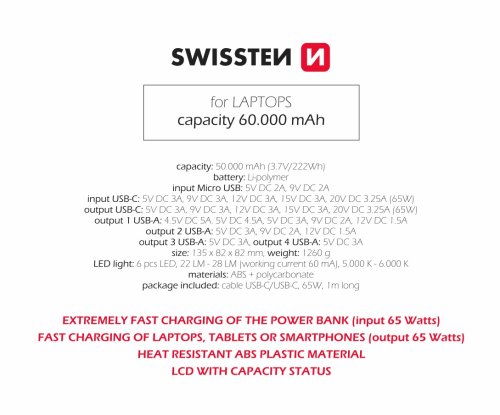 Swissten Power Line je elegantná powerbanka s kapacitou 60 000 mAh , ktorá vďaka vysokému výstupnému výkonu a univerzálnosti umožňuje dobíjať nielen smartfóny a tablety, ale aj notebooky . Vďaka technológii Power Delivery 3.0 a Quick Charge 3.0 ponúka rýchle a efektívne nabíjanie až piatich zariadení súčasne. Powerbanka je vyrobená z nehorľavého materiálu ABS+PC a batéria Li-polymér zaisťujú vysokú bezpečnosť, dlhú životnosť a nízku hmotnosť.