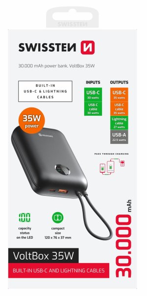 Powerbanka SWISSTEN VOLTBOX tak celkovo ponúka port USB-C, port USB a integrované USB-C a Lightning káble . Je tak vhodná na napájanie ako zariadenia s operačným systémom Android, tak iOS. Kapacita 30 000 mAh je ideálna pre použitie a opakované nabitie smartfónu, tabletu, prípadne drobnej nositeľnej elektroniky ako napríklad bezdrôtové slúchadlá a pod. Praktický LED displej poskytuje informácie o zostávajúcej kapacite batérie, takže hneď vždy viete, kedy je čas na opätovné dobitie.