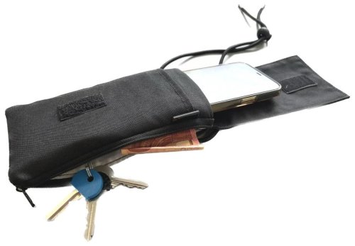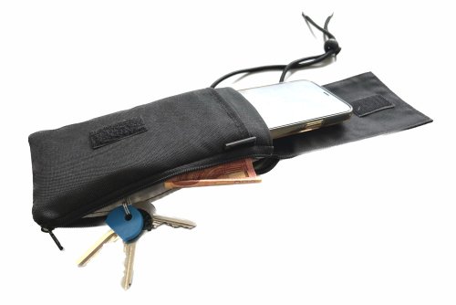 Látkové puzdro na telefón s uhlopriečkou až 6,8" . Je vybavené tromi vreckami , jednou na suchý zips určenú na mobil, druhú na suchý zips na drobnosti a tretiu na klasický zips na platobné karty, doklady, kľúče atď. ruky.