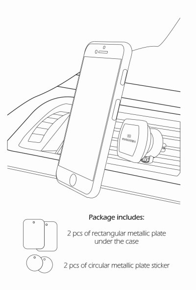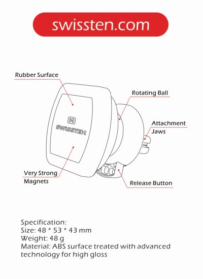 Magnetický držiak pre mobilný telefón určený na upevnenie do ventilačnej mriežky . Vďaka špeciálnym čeľustiam držia v mriežke veľmi pevne. Držiak je možné vďaka rotačnému kĺbu voľne otáčať o 360 ° .