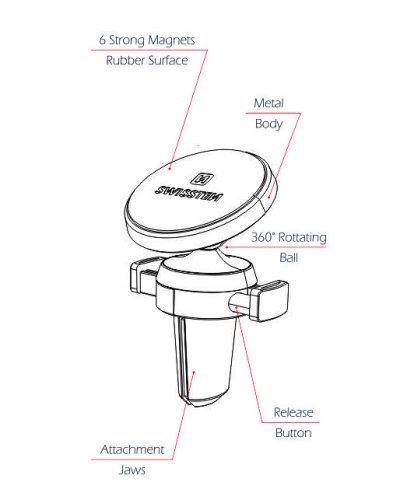 Kovový magnetický držiak pre mobilný telefón určený na upevnenie do ventilačnej mriežky . Je opatrený štyrmi magnetmi a pogumovaným povrchom pre lepšie zabezpečenie telefónu. Držiak je možné vďaka rotačnému kĺbu voľne otáčať o 360 ° .