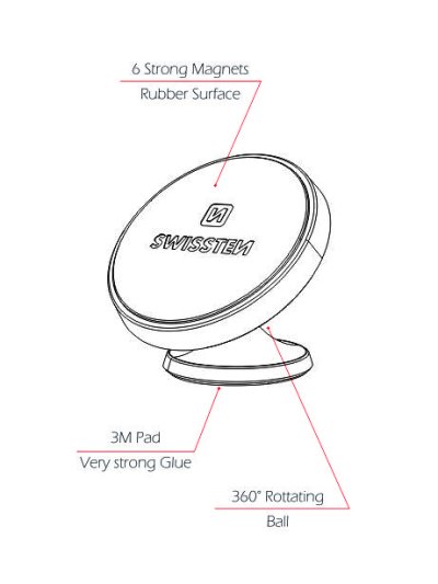 Kovový magnetický držiak do auta v elegantnom dizajne. Je opatrený šiestimi magnetmi a pogumovaným povrchom pre lepšie zabezpečenie telefónu. Držiak je možné vďaka rotačnému kĺbu voľne otáčať o 360 ° . Vďaka flexibilnej podložke s 3M nálepkou veľmi pevne drží aj na zakrivenej palubovke.
