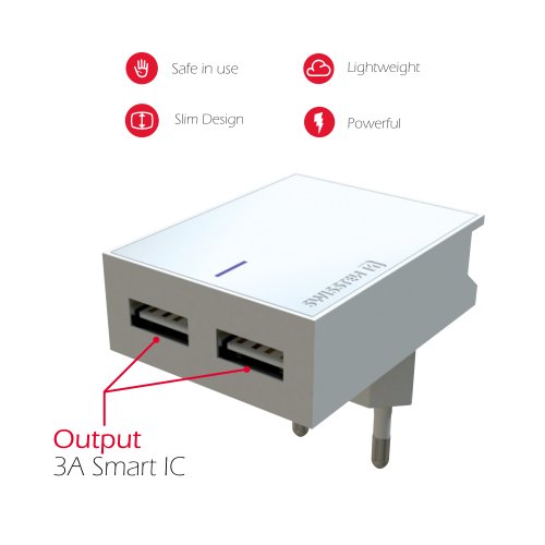 Jedinečný sieťový adaptér disponuje dvoma USB portami s celkovým výstupným prúdom 3 A . Vďaka štýlovému dizajnu ho možno využiť aj ako praktický stojan na umiestnenie práve nabíjaného smartfónu. Nechýba ani technológia Smart IC , ktorá optimalizuje proces nabíjania.