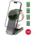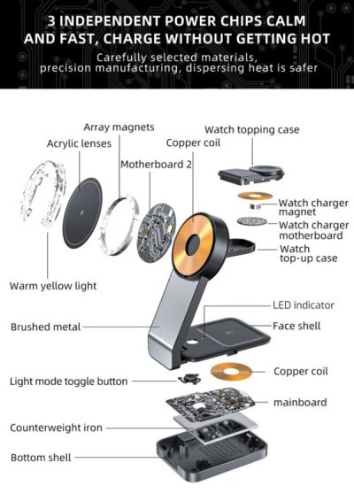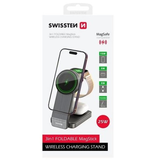 Praktická bezdrôtová nabíjačka ponúka tri nabíjacie plochy , vďaka čomu umožňuje nabíjať súčasne telefón, hodinky aj slúchadlá. Disponuje rýchlym nabíjaním s výkonom až 15 W pre chytrý telefón, 5 W pre slúchadlá a 5 W pre chytré hodinky. Výhoda stojančeka je osvetlenie magnetického rámčeka pri nabíjaní telefónu. Vďaka svetlu krásne rozpoznáte, kam máte telefón umiestniť a vďaka technológii MagSafe (verzia iPhonov 12 a vyššej) sa telefón magneticky zarovná a začne nabíjať. Svetlo sa dá ľahko vypnúť tlačidlom umiestneným pri dobíjaní slúchadiel. K dispozícii je navyše aj funkcia FOD , ktorá dokáže rozpoznať cudzí predmet a okamžite upozorní užívateľa na jeho odstránenie blikaním ukazovateľa nabíjania. S bezdrôtovou nabíjačkou je možné ľahko cestovať a manipulovať, možno jednoducho zložiť aj rozložiť .