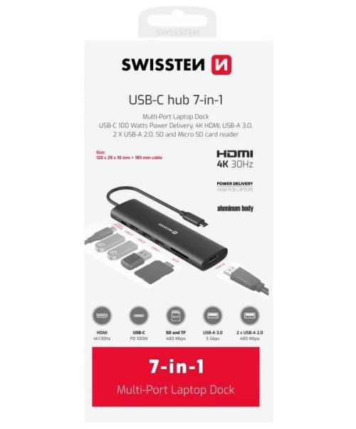 Odolná a kompaktná dokovacia stanica SWISSTEN USB-C HUB 7v1 , s ktorou rozšírite konektivitu svojho notebooku alebo tabletu. Poskytne vám celkom 7 portov na pripojenie periférnych zariadení, ktoré potrebujete pre flexibilnú pracovnú činnosť aj multimediálnu zábavu. Dokovacia stanica SWISSTEN USB-C HUB 7v1 44040202 pripája pomocou portu USB-C, disponuje rozhraním HDMI , ktoré podporuje rozlíšenie 4K pri 30 Hz, USB 3.0 portom s vysokou prenosovou rýchlosťou pre pripojenie flash disku, USB-C pre napájanie s technológiou Power Delivery a dvojicou portov USB 2.0 . Nechýba ani praktická čítačka SD kariet , respektíve microSD kariet . Vďaka kompaktnému hliníkovému dizajnu sa ľahko prenáša, a tak základné porty môžete využívať kdekoľvek na cestách.