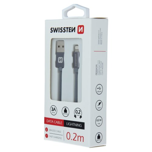 Dátový kábel Swissten USB/Lightning s kvalitným textilným opletením a kovovými krytmi konektorov. Vďaka dĺžke 0,2m je vhodný predovšetkým na nabíjanie z power bánk či notebookov. Kábel je zosilnený a prenesie tak väčší prúd (až 3A) a zvládne aj rýchly prenos dát 480 Mb/s. Životnosť kábla v ohybe je viac ako 10000 ohybov. Kovový kryt konektora je odolnejší proti mechanickému poškodeniu ako bežné plastové kryty konektorov.