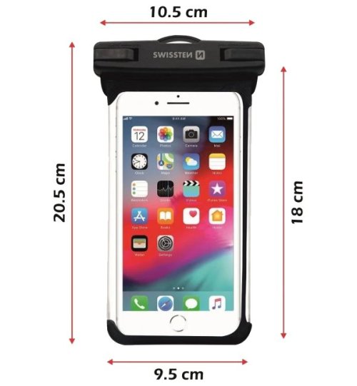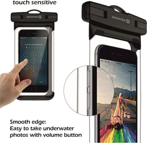 SWISSTEN vodotesné puzdro pre mobilné telefóny s uhlopriečkou displeja až 6,5 palcov. Postará sa o dokonalú bezpečnosť vášho smartfónu, nech už sa plavíte po rieke, bavíte pri bazéne, relaxujete pri chytaní rýb, výlete na parníku a pod. Vodotesné puzdro SWISSTEN spĺňa stupeň krytia IPX8 , a tak je nemysliteľné, aby prenikla akákoľvek vlhkosť. Priehľadná povrchová vrstva umožňuje ovládanie telefónu pomocou dotyku, takže aj počas písania SMS, telefonovania a ďalšieho používania zostane chránený av bezpečí.