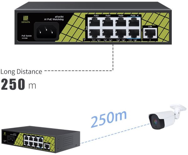 Rýchly ethernetový PoE switch Conexpro je vybavený celkom 9 LAN portami , z toho 1 patrí medzi uplink porty . Perfektne sa hodí na použitie v domácnostiach a rodinných domoch. Postará sa o napájanie až 8 zariadení s nízkou spotrebou - kamery či Wi-Fi prístupové body. Napája ich až na vzdialenosť 250 m pri zníženej linkovej rýchlosti na 10 Mbps.