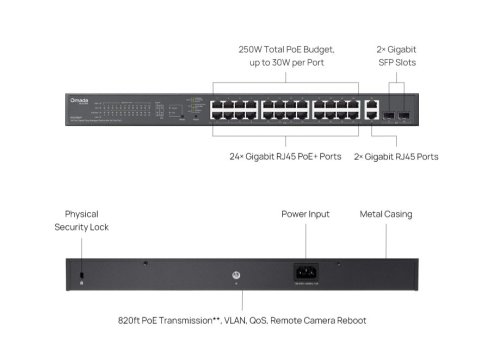 Switch podporuje centralizovanú správu cez cloudovú platformu Omada , vrátane automatickej detekcie zariadenia, vzdialeného reštartu IP kamier a jednoduchej konfigurácie cez aplikáciu či webové rozhranie. Je vybavený funkciami ako VLAN, QoS, izolácia portov a prevencia slučiek , ktoré zvyšujú bezpečnosť a stabilitu siete.