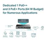 Switch TP-Link TL-SG1006PP je vybavený celkom šiestimi 10/100/1000Mbps RJ45 portami . Z toho má 1 PoE++ port a 3 PoE+ porty. Switch spolupracuje so štandardom IEEE 802.3af/at/bt (kompatibilný s PD). Pomocou kábla súčasne prenášate dáta a napájate zariadenie . Port 1 (štandard 802.3af/at/bt PoE++) poskytuje výkon až 60 W. Porty 2 – 4 (štandard 802.3af/at PoE+) majú výkon až 30 W na každom PoE+ porte. Celkový výkon na napájanie PoE dosahuje hodnotu 64 W . K prepínaču pripojíte IP kamery, prístupové body, IP telefóny, počítače, tlačiarne a ďalšie podobné kompatibilné zariadenia.