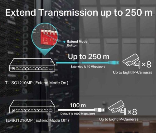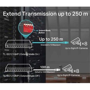 Výkonný PoE prepínač TP-LINK TL-SG1210MP ponúka 8 RJ-45 portov s podporou PoE , 2 GbE RJ-45 konektormi pre LAN a uplink a 1 SFP/RJ-45 Combo port pre uplink . Tento desktopový switch dokáže prenášať napájanie aj dáta jediným káblom priamo k danému koncovému zariadeniu. Prepínač je potom vhodný pre PC, notebooky, tlačiarne, NAS úložisko, Wi-Fi AP , IP kamery , IP telefóny , IP systémy do autobusov alebo rôzne senzory pre automatizáciu budov a správu vozového parku . Ide tak o skvelý doplnok pre rozšírenie počítačovej siete v malých aj stredných firmách alebo kdekoľvek inde, kde je potrebné prepojiť jednotlivé sieťové prvky do hviezdicovej topológie.