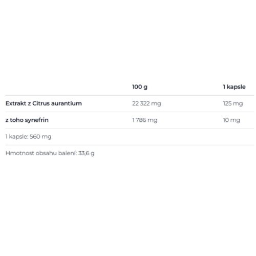 Extrakt z rastliny citrus aurantium, ktorý predstavuje 10 mg synefrínu v jednej kapsuli. Produkt je vyhľadávaný pre efektívnu podporu diétneho režimu, na stimuláciu tukového metabolizmu prostredníctvom navýšenej termogenézy a na zrýchlenie bazálneho metabolizmu. 125 mg extraktu z rastliny citrus aurantium v jednej kapsule, dobre vstrebateľné kapsule. SYNEPHRINE je určený pre: pre neaktívnych jedincov aj pre intenzívne trénujúcich športovcov. Odporúčané dávkovanie produktu SYNEPHRINE: 1 kapsulu užite 30 minút pred fyzickým výkonom. Kapsulu je možné pred výkonom kombinovať s produktmi na báze karnitínu. Maximálne 1 kapsula denne. Neužívajte pred spaním. Neprekračujte odporúčané dávkovanie. Upozornenie: Doplnok stravy. Nenahrádza pestrú stravu. Nie je určené pre deti, tehotné a dojčiace ženy. Ukladajte mimo dosahu detí! Chráňte pred teplom, mrazom a vlhkosťou. SYNEPHRINE zloženie: maltodextrín, extrakt Citrus aurantium (8% synefrínu), želatínová kapsula (želatína, farbivo oxid železa). Dodávateľ: NUTREND DS ., as ., Chválkovice 604, 779 00 Olomouc, Česká republika
