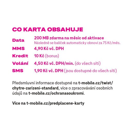 OBSAH KARTY A CENY ZA SLUŽBY 200 MB zadarmo na mesiac od aktivácie, následne sa balíček automaticky obnoví za 75 Kč/mes bonusový kredit 150 Kč volanie 4,50 Kč/min. (do všetkých sietí) SMS 1,90 Kč (do všetkých sietí) MMS 4,90 Kč Ceny sú uvedené vrátane DPH