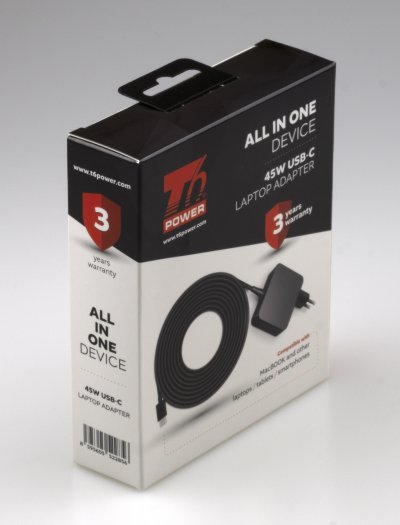 Výkon: 45 W Vstup: 100-240 V ~ 50/60 Hz 1,5 A Výstup: 20 V 2.25 A/15 V 3 A/12 V 3 A/9 V 3 A/5 V 3 A Konektor: USB-C Záruka: 3 roky Dĺžka kábla: 1. Rozmery adaptéra: 96x59x30 mm Hmotnosť: 0.16 kg