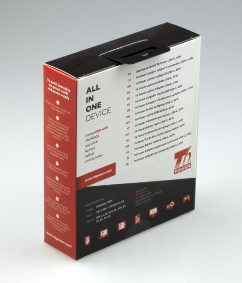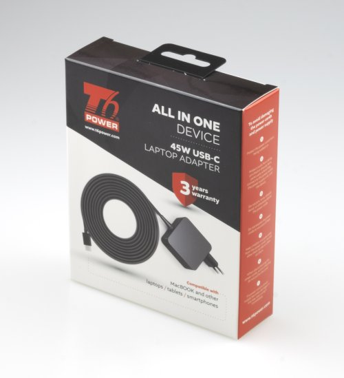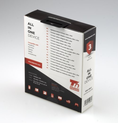 Univerzálny adaptér značky T6 Power s výkonom 45 W je ideálnym zdrojom energie pre notebooky, ultrabooky, MacBooky, tablety, mobilné telefóny, monitory, atď.