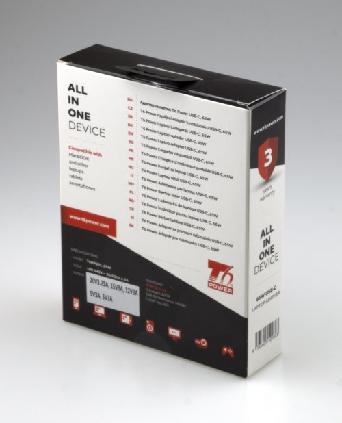 Univerzálny adaptér značky T6 Power s výkonom 65 W je ideálnym zdrojom energie pre notebooky, ultrabooky, MacBooky, tablety, mobilné telefóny, monitory, atď.