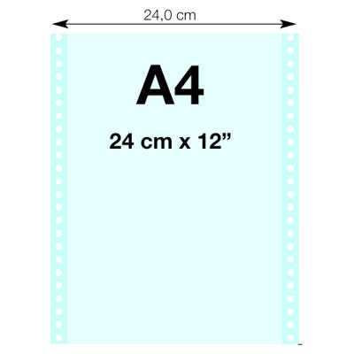 Tabelačný papier s oddeliteľnou bočnou perforáciou 60 g/m² Šírka papiera 24 cm (meraná od kraja ku kraju), výška 12 palcov (tj. 30,5 cm) 1 originál + 1 kópia Balenie obsahuje 1 000 zložiek