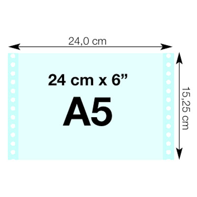 Tabelačný papier s oddeliteľnou bočnou perforáciou 60 g/m² Šírka papiera 24 cm (meraná od kraja ku kraju), výška 6 palcov (tj. 15,24 cm) 1 originál + 1 kópia Balenie obsahuje 1 000 zložiek