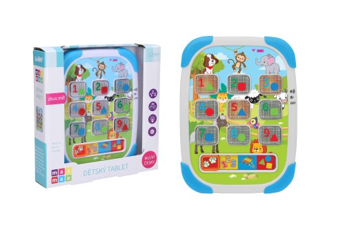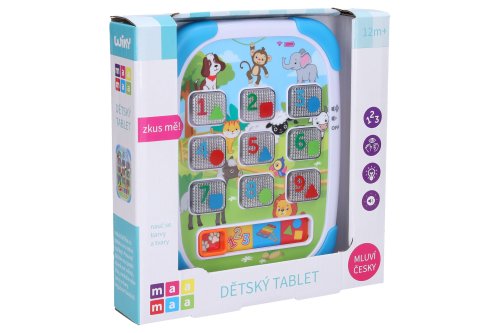 Tablet detský - hovorí po česky. Rozmery 14,5x20 cm. Svetelné a zvukové efekty. 3xAAA batérie súčasťou. Prepínač na pravom boku - vypnuté, nižšia, vyššia hlasitosť. 4 módy posunom oranžového štvorca a následné stlačenie čísel - 1. výučba zvieratiek, 2. výučba čísel, 3. zvuky xylofónu a melódie, 4. výučba farieb a tvarov.