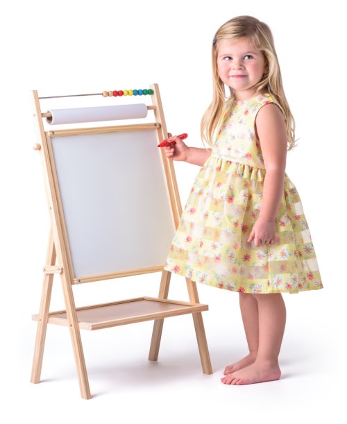 Magnetická obojstranná školská tabuľa v praktickom prevedení s tyčkou pre rolu papiera. Z jednej strany je tabuľa čierna na maľovanie kriedou az druhej je biela na maľovanie suchou fixkou. Vo vrchnej časti tabule je umiestnené jednoduché počítadlo. | Rozmer: 40,5 x 80,5 x 4,5 cm. Vek: 3+.