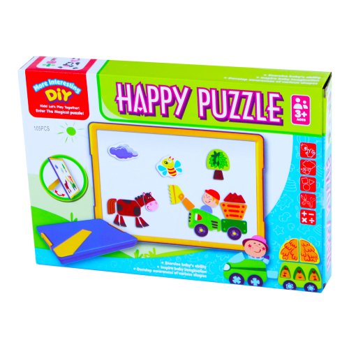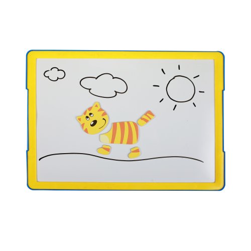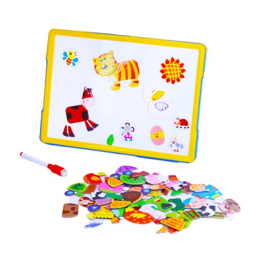 Skvelá magnetická tabuľka s obrázkami pre kreatívne detičky. Vytvor si obrázok podľa svojej fantázie! Pokiaľ si nebudeš vedieť rady, môžeš pochytiť inšpiráciu v šablónach, ktoré sú vyobrazené na zadnej strane obalu. Balenie obsahuje cca 105 magnetických kúskov. Súčasťou je fixka, ktorou môžeš na tabuľku písať či kresliť. Tabuľka má rozmer 29 x 21 cm a je opatrená praktickým stojanom na stôl. Táto hračka rozvíja zmyslové vnímanie, motoriku a trpezlivosť.