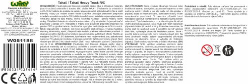 Ťahač Heavy Truck svietiaci RC na diaľkové ovládanie. Rozmery 23,5x11x11 cm. Frekvencia 27MHz. Svetelné efekty povrchu ťahača. 4xAA batérie do ťahača, 2xAA do ovládača nie sú súčasťou. Try Me tlačidlo pre svetelné efekty v obale - 3xAG13 batérie (nemeniteľné) súčasťou. Pri vybaľovaní je nutné odpojiť Try Me kábel z ťahača. Rýchlosť 10 km/h. Dosah až 20 m. Prepínač ON/OFF na spodnej strane ťahača.