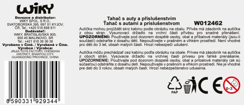 Ťahač s autami. Veľkosť ťahača 42 cm. Voľné kolesá. Súčasťou 5 autíčok, 1 vrtuľník. Autíčka môžu prechádzať cez kabínu podľa obrázku na obale. Príves má zásobník na autíčka z oboch strán. Vysúvacie držadlo na vrchnej časti prívesu pre ľahké prenášanie.