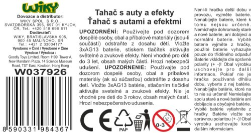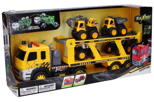 Ťahač so 4 autami a efektmi. Veľkosť ťahača 45 cm, malých áut 8-10 cm. Na zotrvačník. Svetelné a zvukové (cúvanie, trúbenie, zvuk plošiny, motor) efekty na kabíne ťahača. 3xAG13 batérie do ťahača súčasťou.