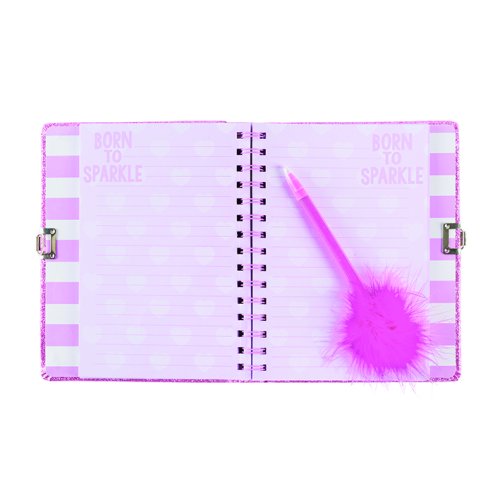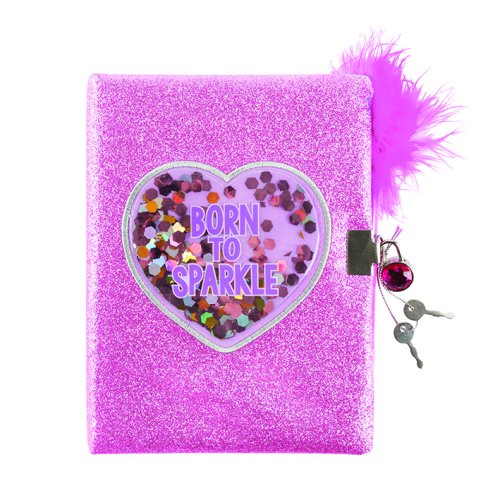Denník s trblietavými a tvrdými doskami. Obsahuje 160 farebných stránok, pero s pierkom a zámok s klíčkami. Vhodné od 6 rokov.