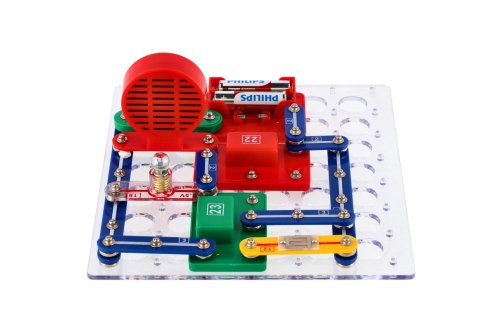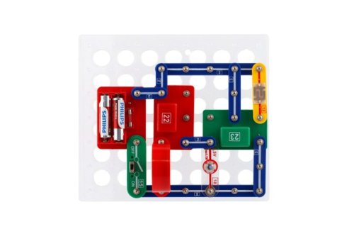 Elektronická stavebnica, z ktorej je možné zostaviť podľa návodu až 180 projektov. Stavebnici môžu deti nielen stavať. Skúša si na ňu aj elektronické projekty ako je práca motora, prepínačov alebo zdrojov zvuku a svetla. V krabici 42x28,5x4 cm. Vhodné od 6 rokov.