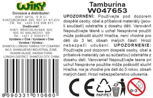 Tamburína 15,5 cm. 2 varianty - modrá, ružová. Presné rozmery 15,5x3x13 cm.