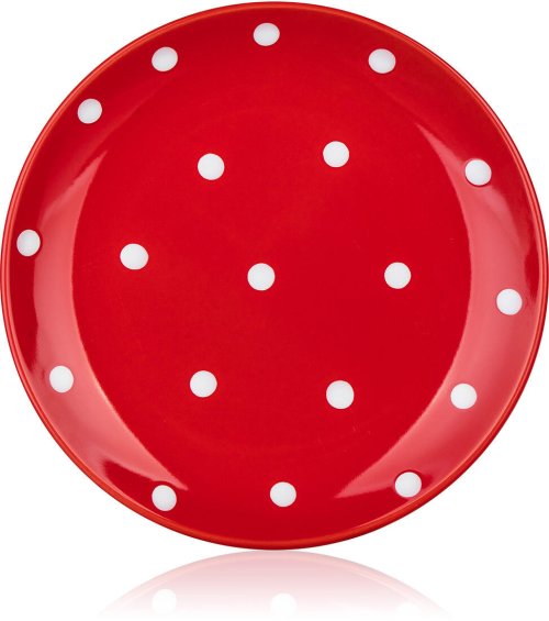 Dezertný tanier DOTS, v červenej farbe s bielymi bodkami, je vyrobený z kvalitnej keramiky. Možno použiť do mikrovlnnej rúry aj do umývačky na bežné domáce použitie.