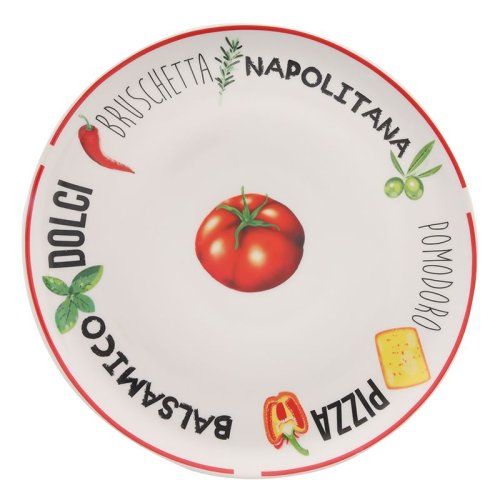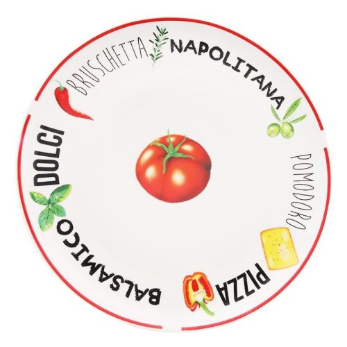 Hľadáte nové taniere na pizzu? Na týchto veľkých pizzových tanieroch môžete podávať tie najchutnejšie pizze! Jedálenský stôl tak môžete naplniť lahodnými pizzami na pekných tanieroch. Taniere sa dodávajú v 2 farbách, červenej a zelenej s mierne odlišnou potlačou. Vyzerajú skvele na stole doma, ale hodia sa aj do gastronómie. Tieto pizzové taniere majú priemer 30CM, vďaka čomu sú vhodné pre väčšie pizze, ale samozrejme na nich môžete podávať aj menšie pizze . vlastnosti:Výrobok: Taniere na pizzuFarba: Červená s ozdobouMateriál: PorcelánPriemer: 30cmVýhody:Možno umývať v umývačkeVhodné do rúry a mikrovlnky