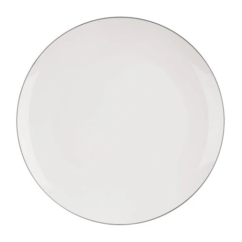 Elegantný porcelánový plytký tanier má hladký biely povrch a je zdobený jemnou čiernou linkou po okraji, ktorá podčiarkuje jeho vycibrený vzhľad. Ideálny štýlový doplnok pre každú domácnosť. Materiál New Bone China – veľmi kvalitný, pevný a odolnejší ako bežný porcelán. Rozmery priemer 27.5 cm. Možno umývať v umývačke a použiť v MVT. EAN 8592381256234