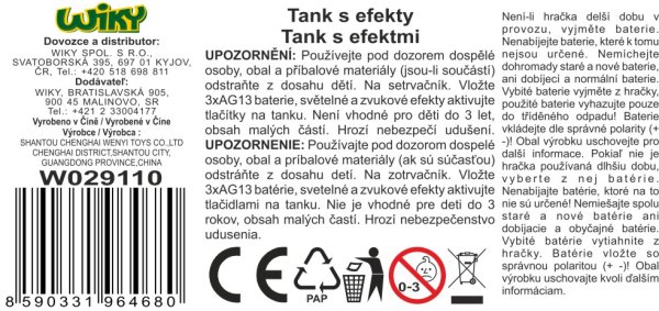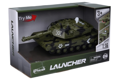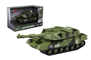 Tank s efektmi. Veľkosť 25 cm. Na zotrvačník. Svetelné a zvukové efekty tlačidlami na tanku. 3xAG13 batérie súčasťou.