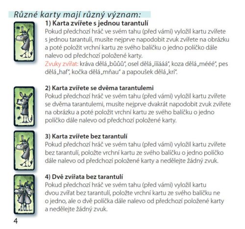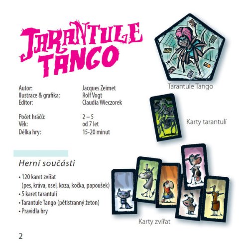 Obsah balenia: 115 kariet zvierat 5 kariet tarantúl Tarantula Tango (päťstranný žetón) české a slovenské pravidlá hry