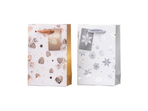 Taška darčeková 100x150 mm vločky, šišky mix, biela, bronzová, šedá