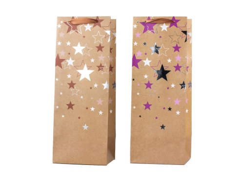 Vysoká darčeková taška o rozmere 150×400 mm zdobená motívom hviezdičiek v mixe prírodnej, fialovej, bielej a hnedej farby. Je vyrobená z kvalitného pevného papiera a vhodná pre fľaše alebo úzke darčeky. Elegantné prevedenie sa hodí pre celoročné aj vianočné darčekovanie. Tovar je dodávaný v mixe. Doručovaný tovar je vyberaný náhodne a nie je možné vybrať konkrétne prevedenie.
