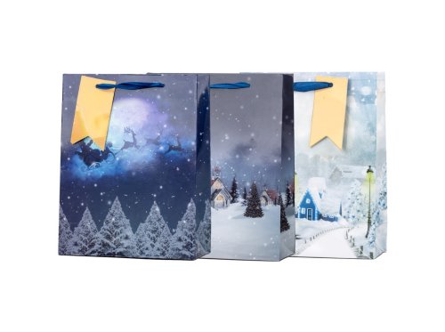 Stredná darčeková taška o rozmere 180×230 mm s krásnymi motívmi zimnej krajiny v pestrom farebnom mixe. Vhodná pre všemožné darčeky - kozmetiku, sviečky, dekorácie, drobné textilné produkty alebo sladkosti.