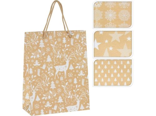 Taška darčeková 23 x 18 x 10 cm, (M), VIANOČNÉ, mix dekorov. rozmery: 23 x 18 x 10 cm materiál: papier mix 4 dekory: Merry Christmas, sob, stromček, ozdoba Darčeková taška vo vianočnom dekore.