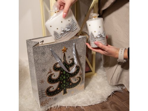Veľká darčeková taška o rozmere 260×320 mm s farebným mixom vianočných motívov stromčekov a ozdôb. Taška je vyrobená z kvalitného pevného papiera a doplnená odolnými ušami pre ľahké prenášanie.